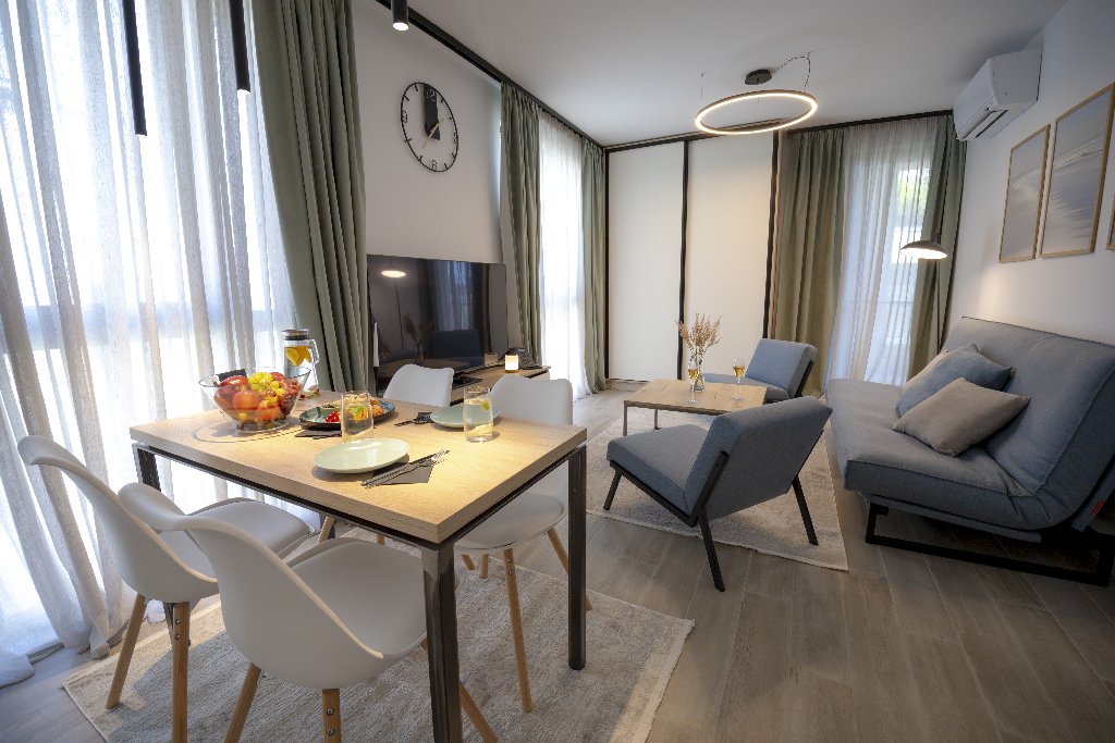 Facilitati premium in camera: bucatarii moderne cu electrocasnice de ultima generatie, dormitoare confortabile cu lenjerie de pat de lux, zone de zi elegante cu WiFi si televizoare inteligente si bai complet echipate, inclusiv masina de spalat.