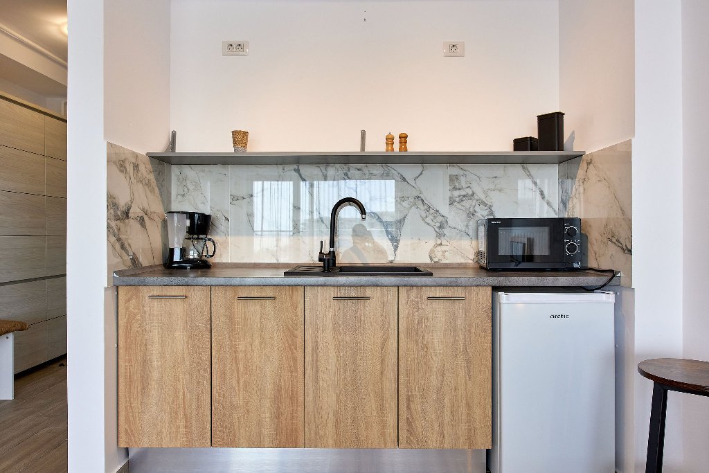 Bucatarie:Zona de bucatarie este complet echipata cu toate facilitatile necesare pentru a pregati si a servi mese delicioase. Fie ca doriti sa gatiti un mic dejun rapid sau sa preparati o cina romantica, veti gasi tot ce aveti nevoie: plita electrica, cuptor cu microunde, frigider, masina de cafea si ustensile de gatit.