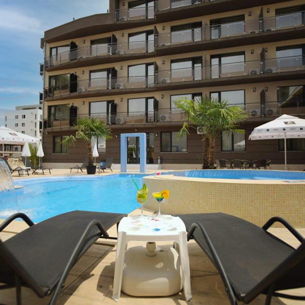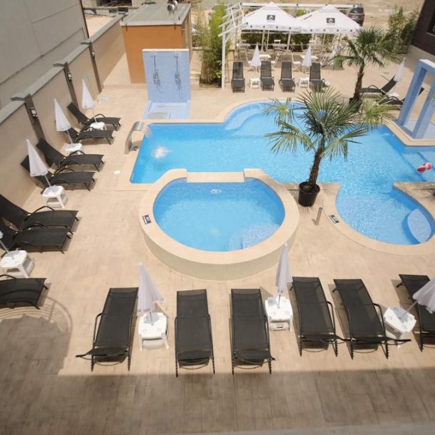 Complexul Dedal dispune si de o piscina exterioara amenajata cu sezlonguri si umbrele si bar.