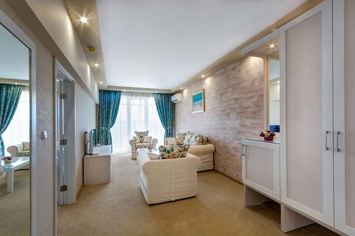 Apartament 1 dormitor- aprox. 55 mp. (min, ocupare - 3 persoane, ocupare max. - 2+2/3+0). Apartamentele constau dintr-un living si un dormitor. Aer conditionat, canapea si masa de sufragerie, TV cu ecran plat, telefon, frigider, seif (gratuit), Wi-Fi (gratuit), dus, cabina de dus, uscator de par, balcon mobilat. Sunt disponibile apartamente cu vedere la piscina sau la mare (Vedere la mare este oferita in functie de disponibilitate la check-in, cu un cost suplimentar platit la receptie).