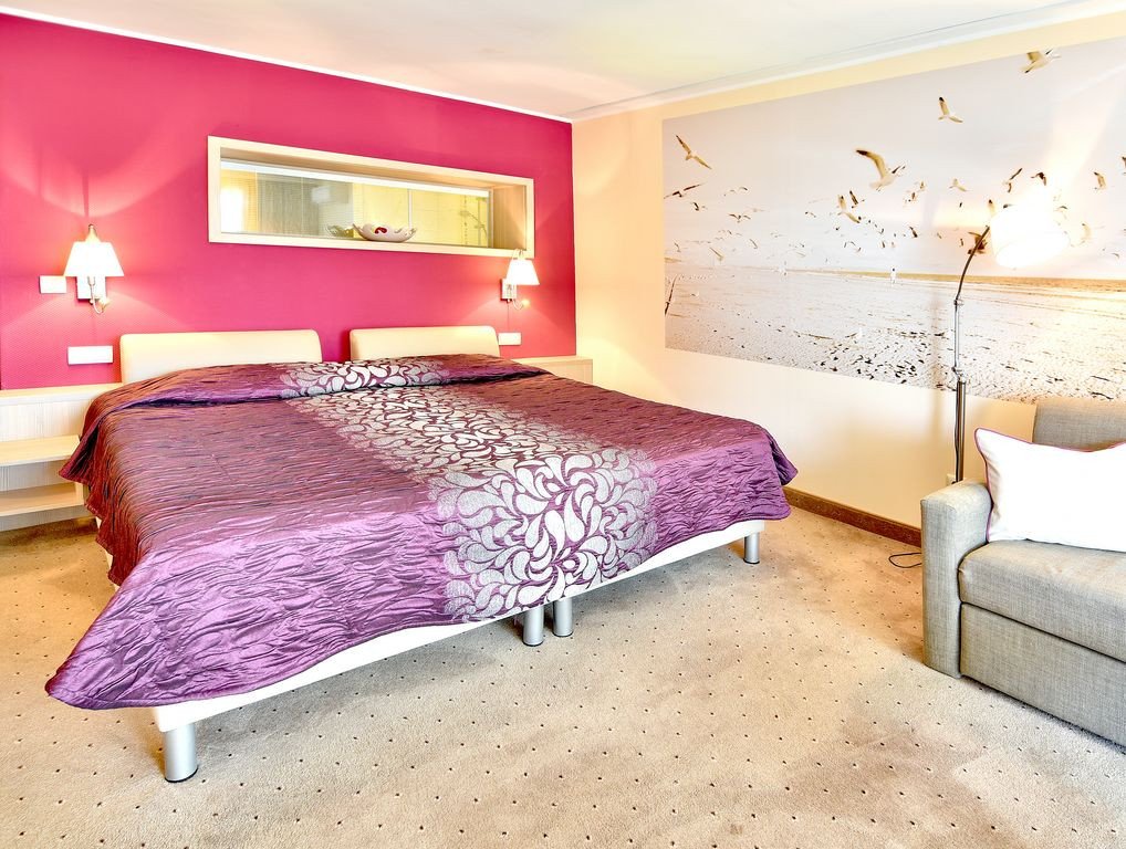 DBL 2+1 / 2+2 DELUXE SEA: aprox 37 m2 Spatioase si mobilate luxos, camerele deluxe cu vedere la mare sau la gradina va vor oferi o senzatie de relaxare de neuitat. Pernele confortabile te vor transporta sus in nori, iar de pe balconul larg te vei putea bucura de o priveliste de neuitat in timp ce sorbesti cafeaua sau ceaiul de dimineata din soiurile selectate care te asteapta in camera. Sau pur si simplu relaxeaza-te in fata televizorului de 43 inch. Pentru siguranta dumneavoastra, exista un seif in fiecare camera. De asemenea, sunt dotate cu set de calcat, telefon si minibar, aer conditionat. Dormitor cu doua paturi de o persoana, canapea extensibila, dus, balcon de 9 mp. Camerele Deluxe cu vedere la mare sunt situate la etajele 5 si 6. Numar maxim de persoane: 3 adulti sau 2 adulti si 2 copii.