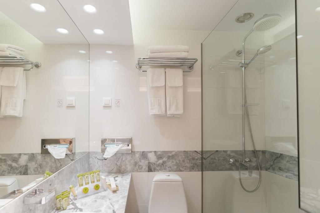 Camerele sunt moderne și au podea cu parchet și mobilier din lemn de culoare deschisă. Unitățile de cazare includ TV prin satelit, seif și ferestre izolate fonic. Majoritatea camerelor oferă balcon privat, iar unele au vedere la Acropolă.