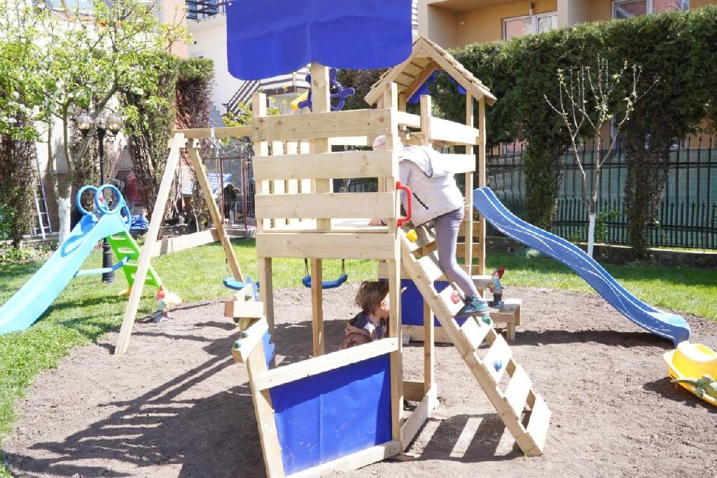 Locul de joaca dispune de mini bucatarie cu ustensile(oliceke, pahare, ligirite) pentru joaca copiilor, mingii, cos de baschet, leagan, tobogan, masute si scaune, bancute, trambulina, multe jucarii.