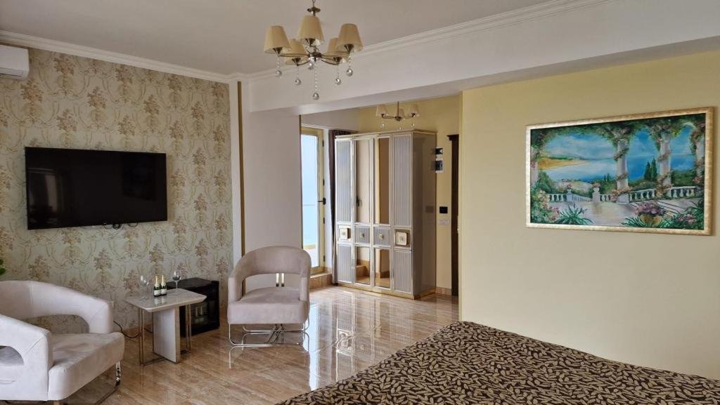 Camerele duble deluxeau un mobilier mai clasic sisunt dotate cu pat matrimonial king size (180x200), baie proprie cu dus walk in, uscator de par, cosmetice hoteliere, LCDTV (diagonala mai mare decat cele din dublele standard) si cablu, wi fi, minibar, aer conditionat,terasa mobilata cu scaune sisezlonguri acolo unde permite spatiul. Suprafata 32 mp. Toate camerele oferavedere la mare.