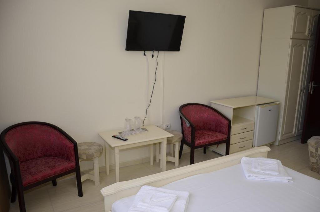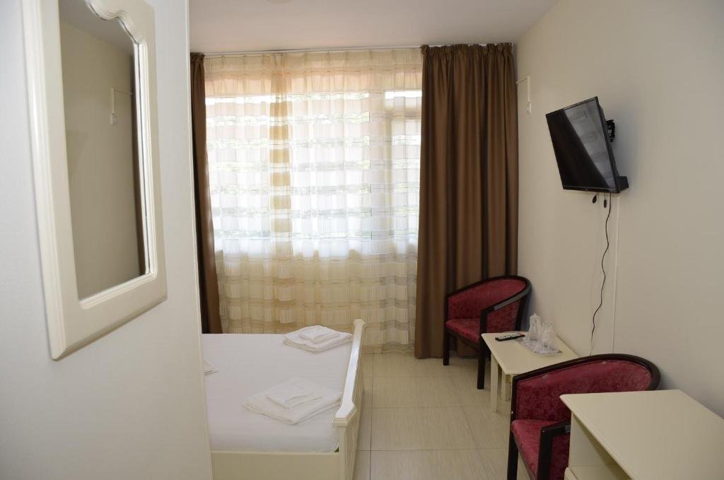 Hotelul dispune de 70 de camere duble pentru cazare cu bai proprii, Tv,frigider si aer conditionat, pardoseli de gresie cu covorase, tamplarie Pvc, mobilier nou deosebit. 20 de camere dispun de vedere la mare. Parcare pazita in curtea unitatii.